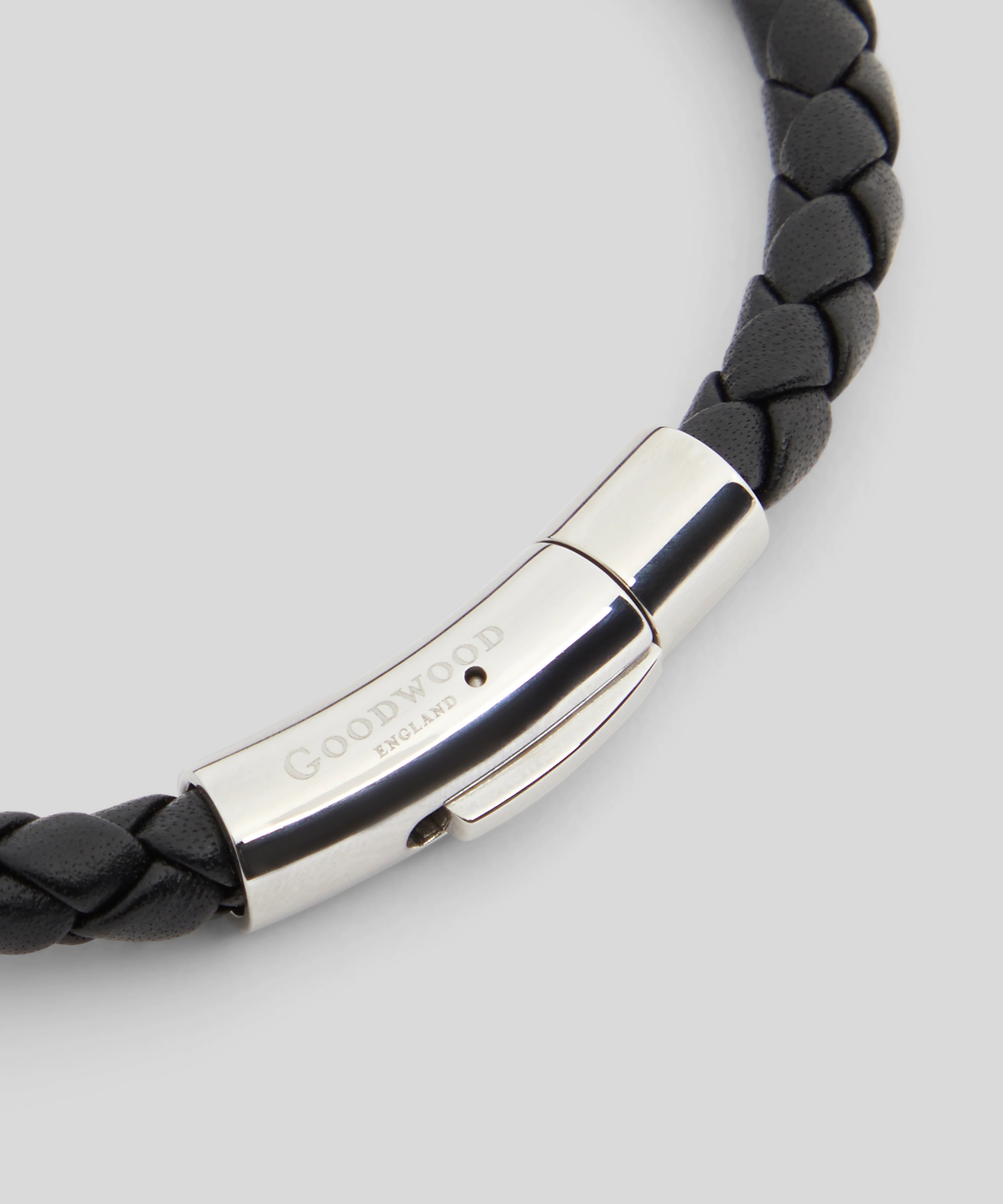Experience a touch of sophistication and exclusivity with the Goodwood Leather Bracelet - a slim, woven piece available in classic black or striking black and white to perfectly complement our Goodwood Festival of Speed collection. Its stainless steel trigger clasp, adorned with a laser-etched Goodwood England logo, adds a touch of refined elegance to this modern, masculine design. Elevate your look with a fresh and clean contemporary accessory.