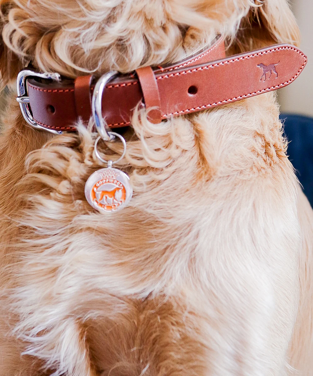 A beautiful leather dog collar in supple brown leather, with orange stitching. With silver buckles and fastenings and the Goodwoof dog embossed on the outside of the collar and 'Goodwoof' embossed on the inside of the collar into the leather. Made in England.